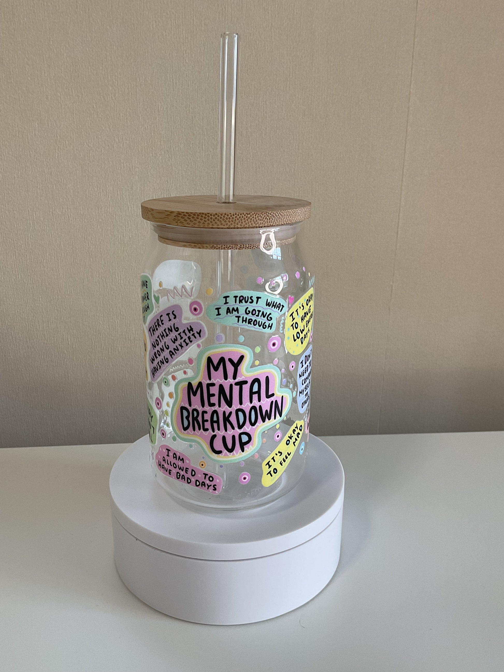 Libbey glass beer can 16oz with bamboo lid & glass straw.